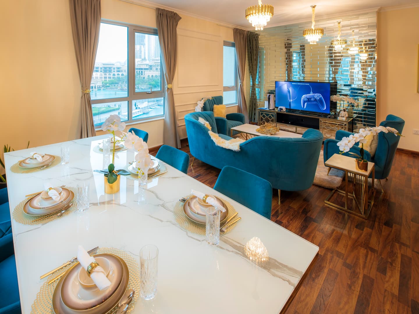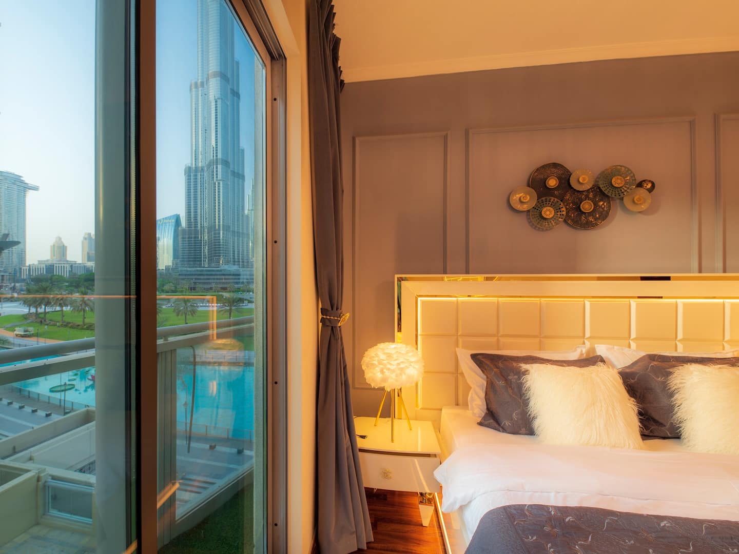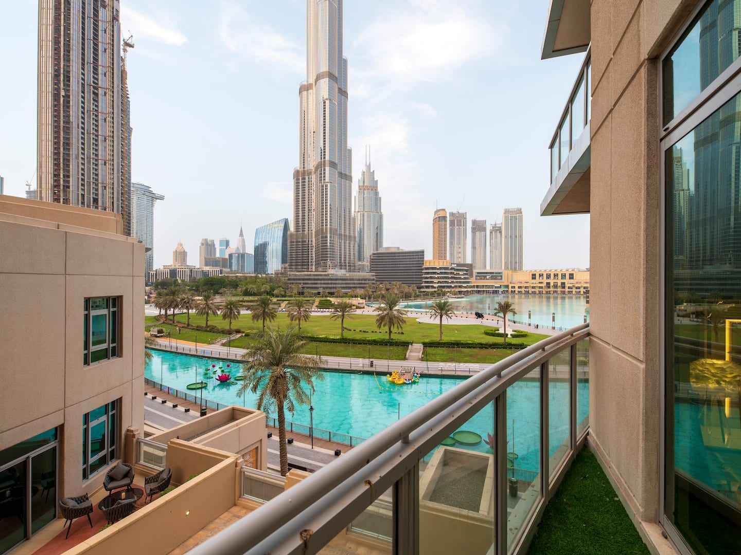 This luxuriously designed apartment has a direct full view from the balcony on the tallest building in the world Burj Khalifa and the famous dancing fountain.