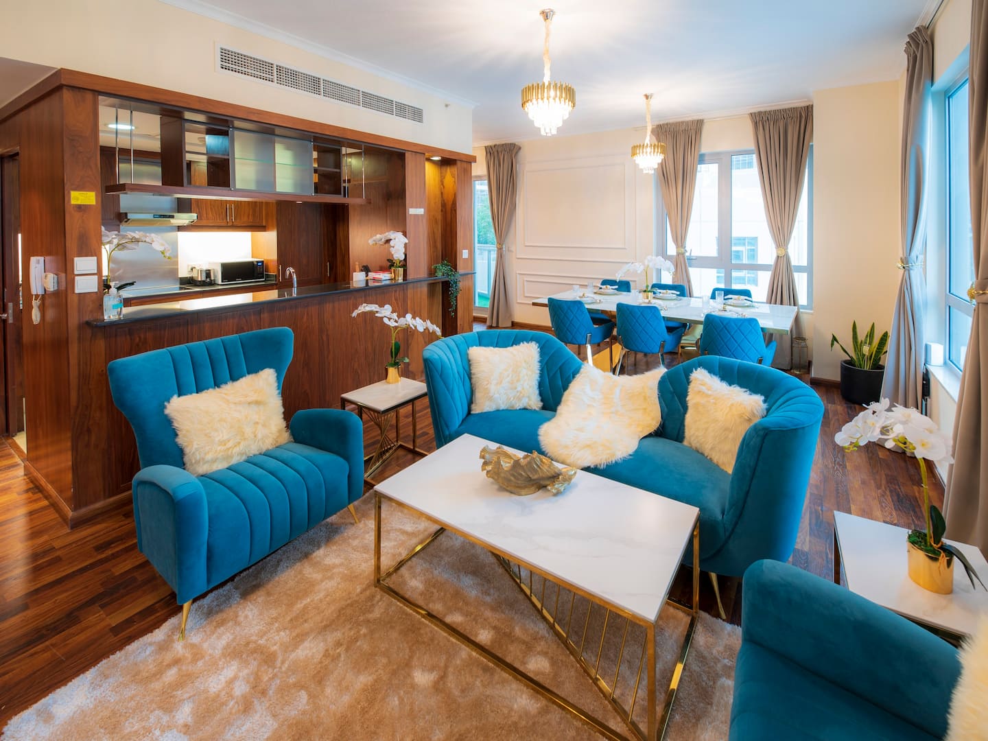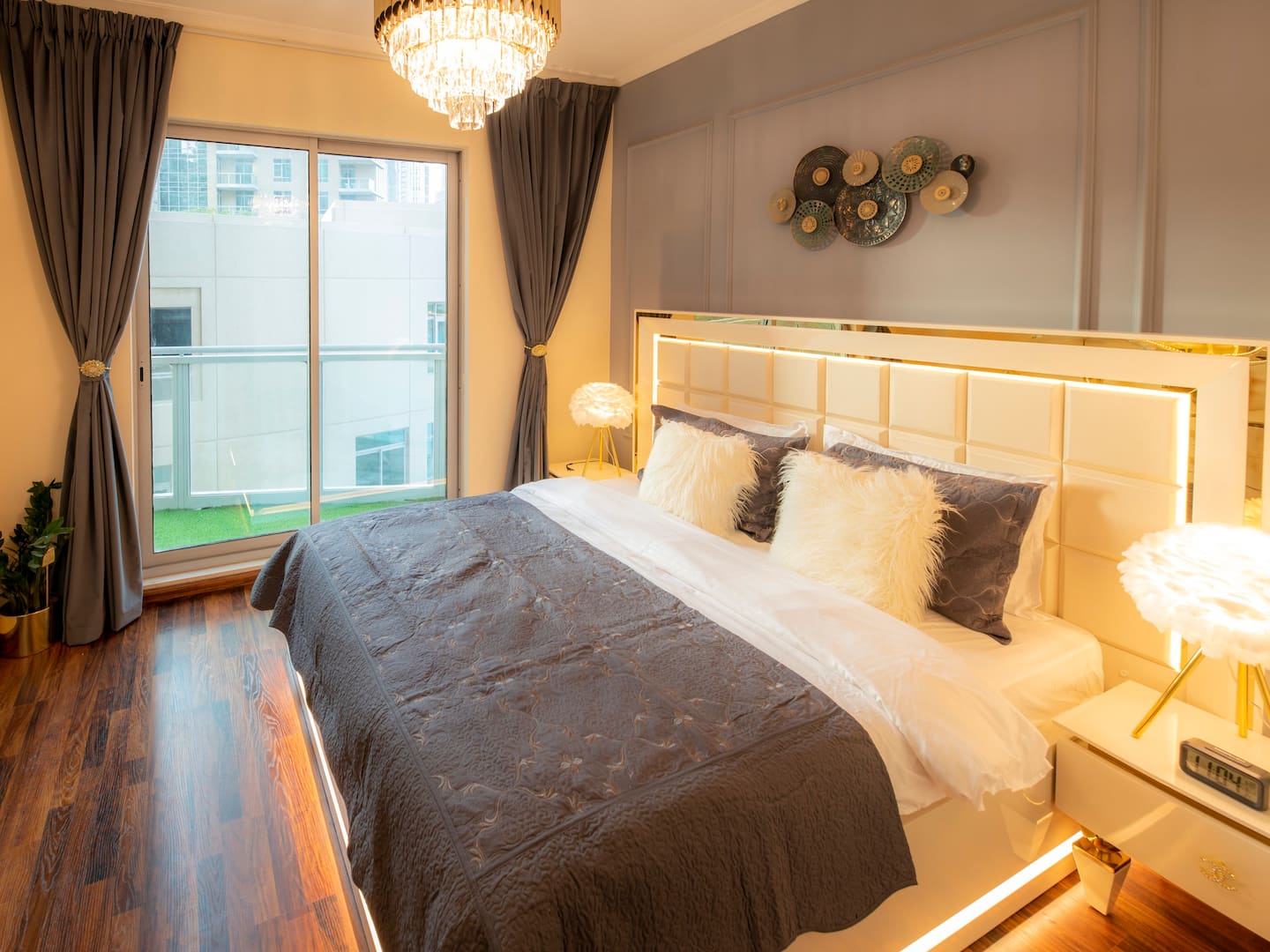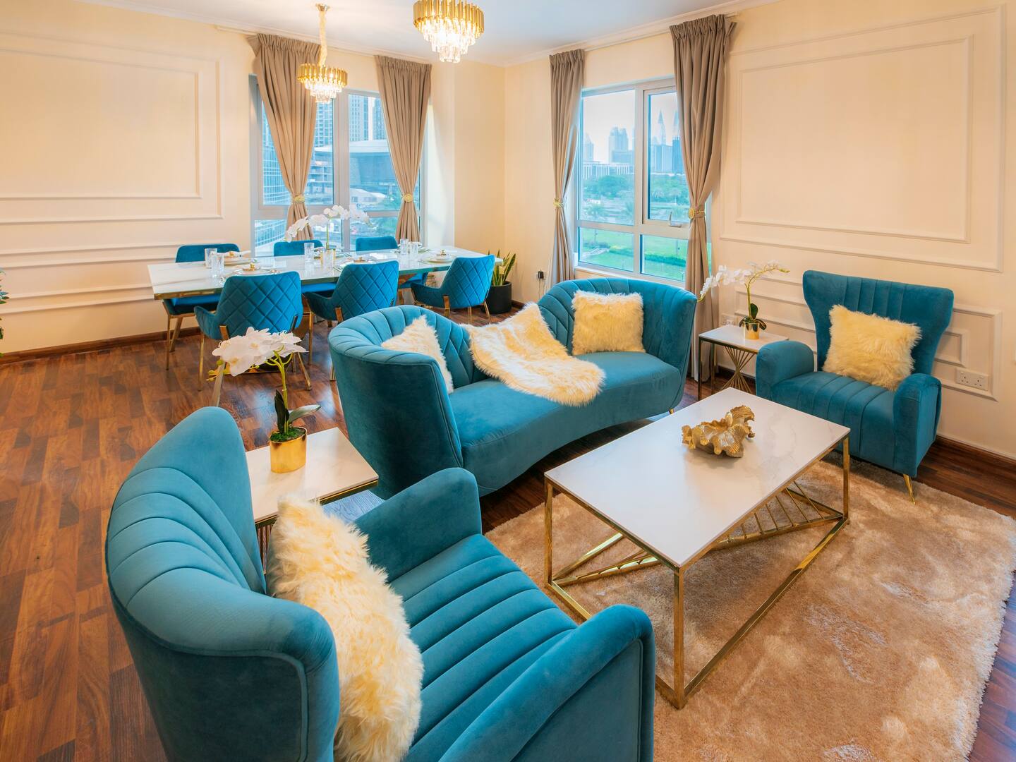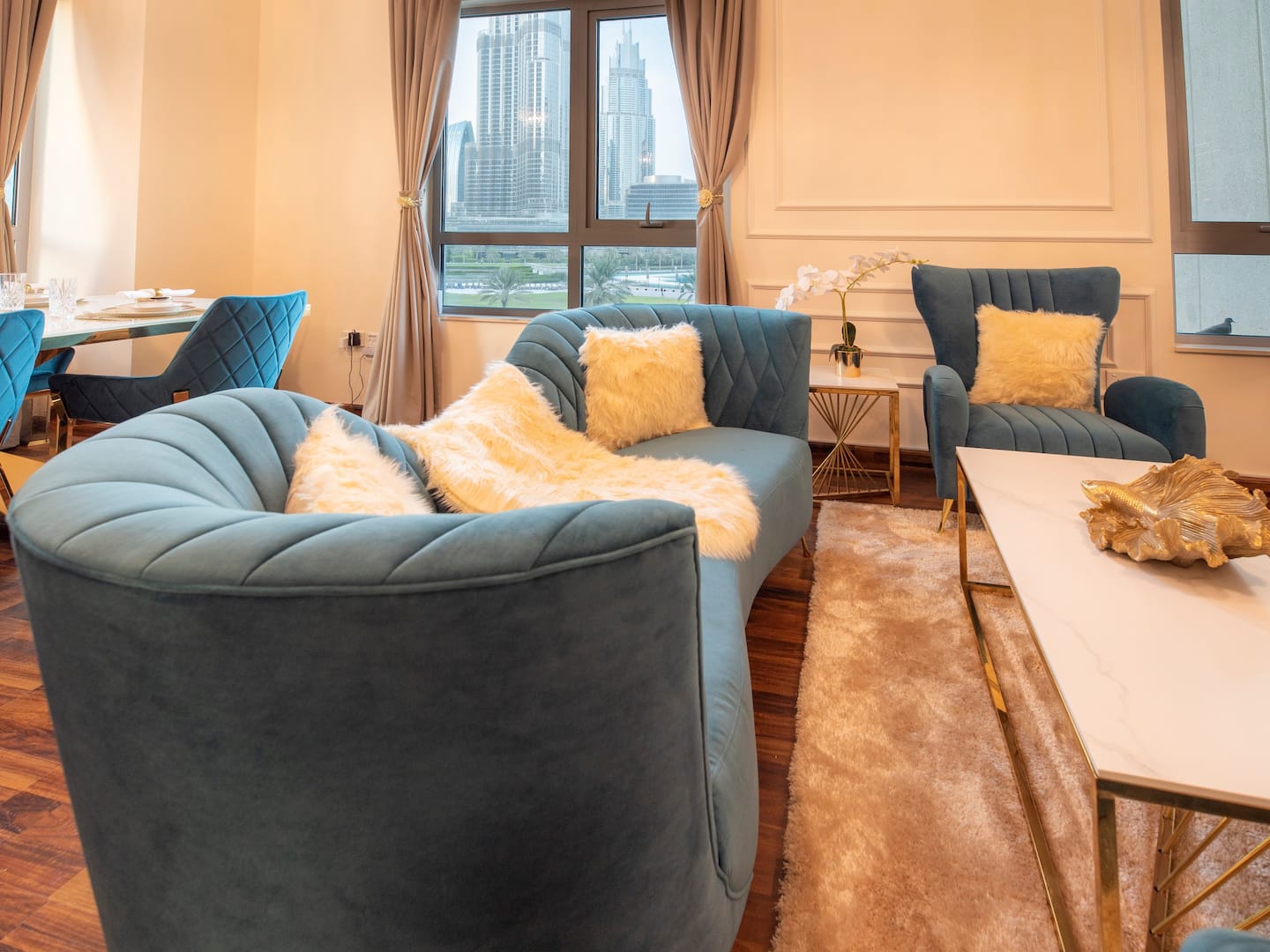 This newly furnished two bedroom apartment is located in one of the most premium buildings in Downtown Dubai! This newly furnished apartment exemplifies the glamour and luxurious lifestyle of Dubai. It is literally located right across the road from the Burj Khalifa which is the tallest tower in the world! Also, the tower is connected to the Bruj Park! Wait till you see the rest of the facilities which include a fitness center, kids area, squash courts etc. This welcoming space draws you in with its refreshing colour palette, allowing you to energize and rejuvenate yourself. The flawless space consists of two majestic bedrooms with built-in wardrobes for your convenience, a kids bedroom, a living room, a terrace accompanied by the breathtaking views on the worlds tallest tower - The Burj Khalifa, the Dubai Mall, Dubai Fountain along with Downtown Dubai, and a state-of-the-art kitchen which is fully equipped with high-end appliances and a handy service window to the dining area, making it easy to serve up your favorite dishes. Our apartments are exclusively designed for your optimal privacy, we offer video intercom access, pool, fully-equipped gymnasium and for your safety and protection 24 hours’ security available in the building. Our apartments are rented solely for our guests thus, you have a key card system which allows you to utilize the private building parking, following an elevator straight to your apartment. The apartment itself is secluded and offers you prime privacy for your relaxation. As soon as you arrive you will be welcomed by our guest experience manager, who will be at your service 24 hours a day regarding any matter. One day prior to your departure I will contact you for your check out details. As we truly respect your privacy we will not cause any disturbance to you during your stay, until and unless you have requested it.