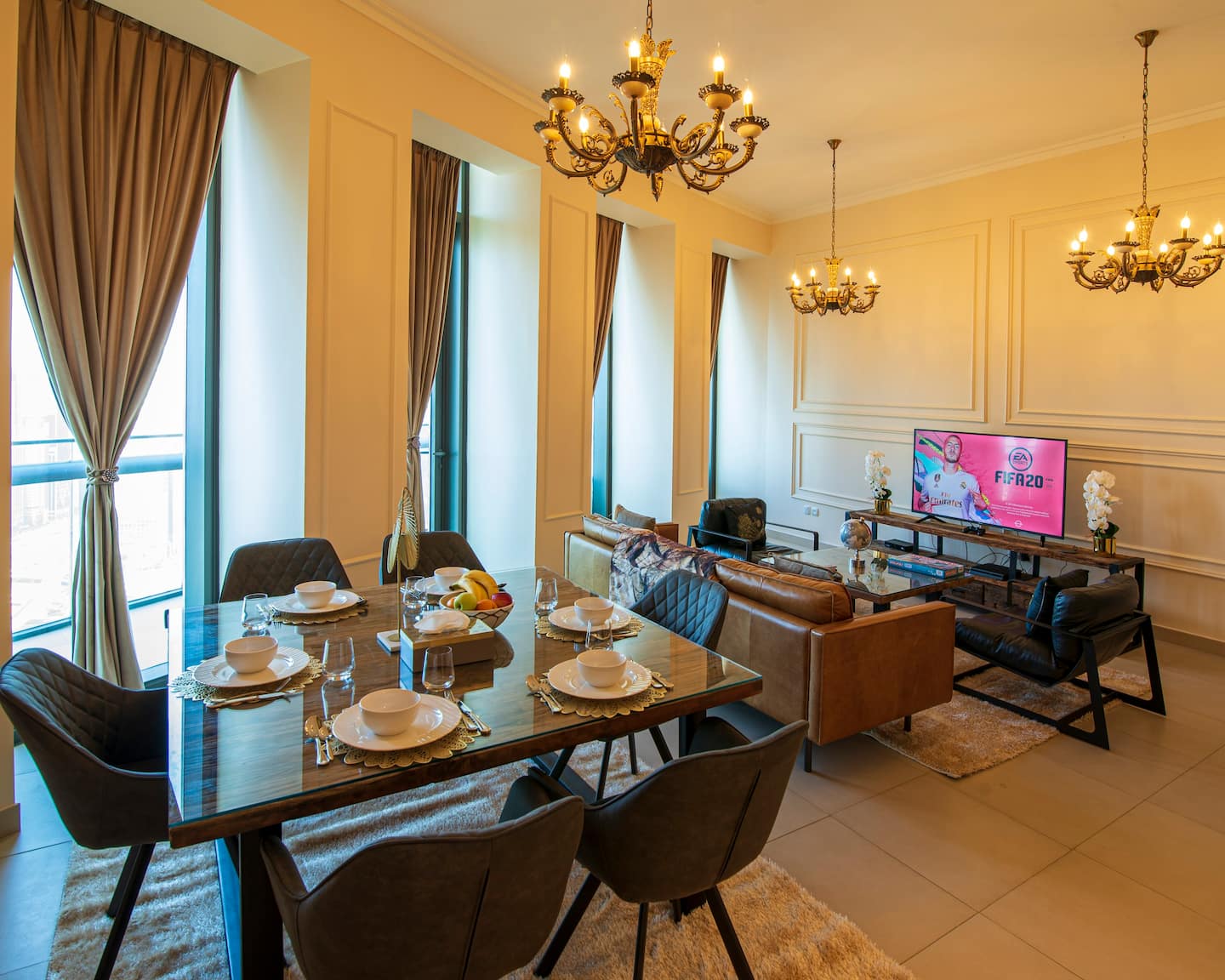 The apartment has a direct link to the Dubai Mall and Metro and 2 Swimming pools, gymnasium, games room with pool tables & football tables and a tennis court.